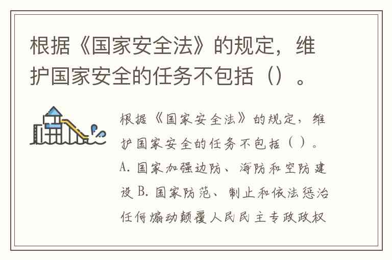 根据《国家安全法》的规定,维护国家安全的任务不包括()。A.国家加强边防、海防和空防建设 B.国家防范、制止和依法惩治任何煽动颠覆人民民主专政政权的行为 C.国家为人民的根本利益要积极对外扩张 D.为人民创造良好生存发展条件和安定工作生活环境