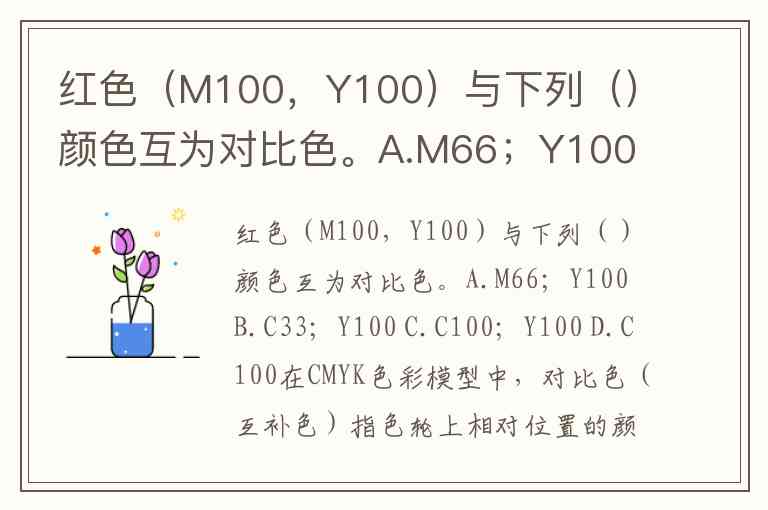 红色(M100,Y100)与下列()颜色互为对比色。A.M66;Y100 B.C33;Y100 C.C100;Y100 D.C100