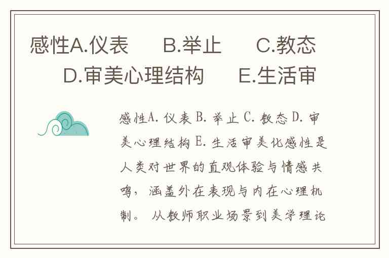 感性是人类对世界的直观体验与情感共鸣,涵盖外在表现与内在心理机制。 从教师职业场景到美学理论视角,选项中仪表(A)、举止(B)、教态(C)属于感性的外显行为,审美心理结构(D)是感性的内在基础,而生活审美化(E)则是感性体验在当代社会的弥散现象。
