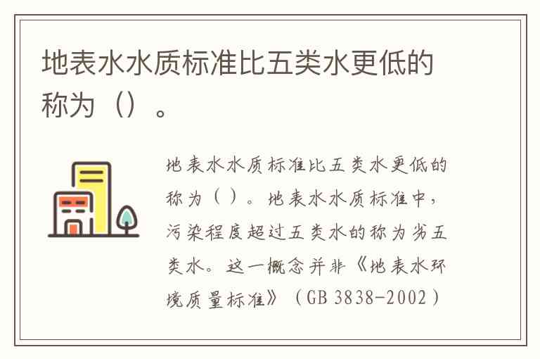 地表水水质标准中,污染程度超过五类水的称为劣五类水。这一概念并非《地表水环境质量标准》(GB 3838-2002)中规定的正式分类,而是实际评价中用于描述重度污染水体的补充类别。