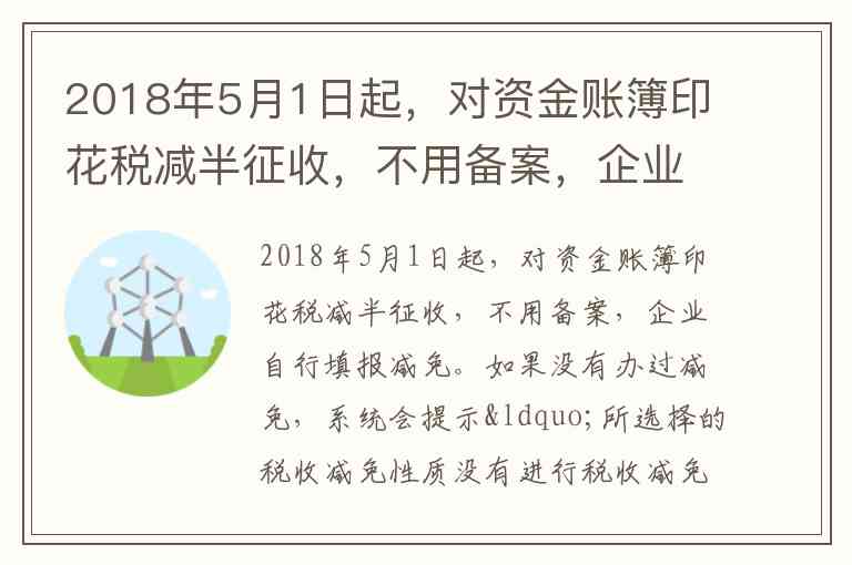 2018年5月1日起,对资金账簿印花税减半征收,不用备案,企业自行填报减免。如果没有办过减免,系统会提示“所选择的税收减免性质没有进行税收减免备案”,但是仍然可以保存,减免额为应纳税额的一半。