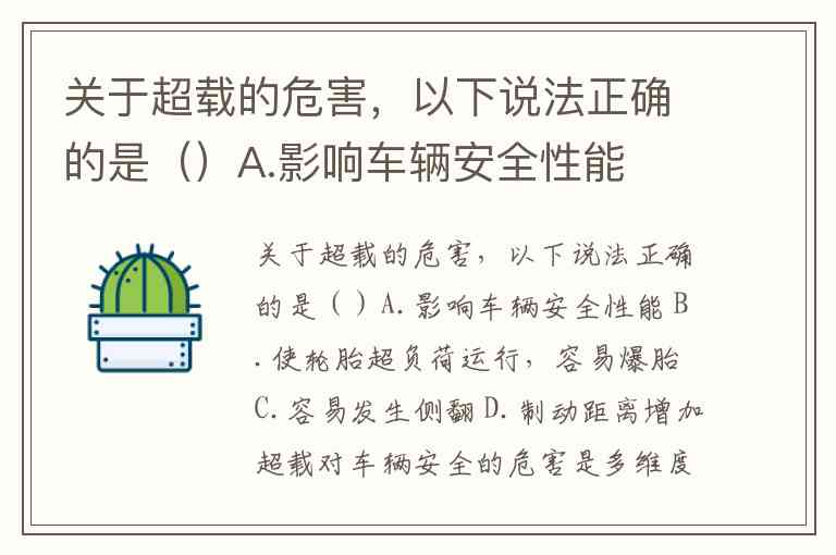 关于超载的危害,以下说法正确的是()A.影响车辆安全性能 B.使轮胎超负荷运行,容易爆胎 C.容易发生侧翻 D.制动距离增加