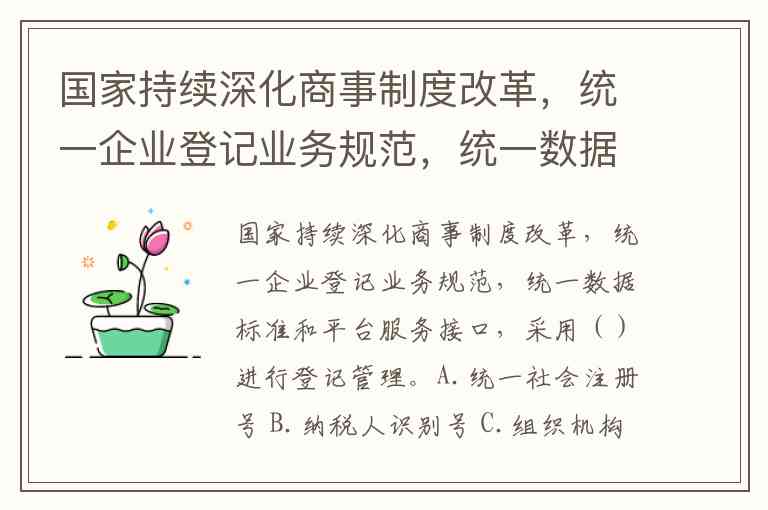 国家持续深化商事制度改革,统一企业登记业务规范,统一数据标准和平台服务接口,采用()进行登记管理。A.统一社会注册号 B.纳税人识别号 C.组织机构代码 D.统一社会信用代码