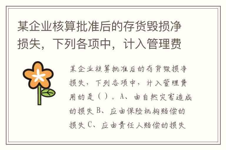 某企业核算批准后的存货毁损净损失,下列各项中,计入管理费用的是()。A、由自然灾害造成的损失 B、应由保险机构赔偿的损失 C、应由责任人赔偿的损失 D、管理不善造成的损失