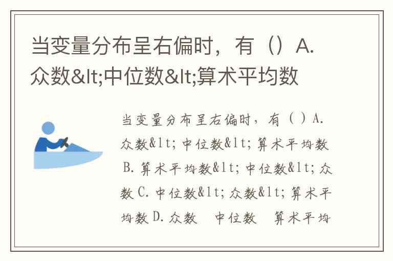 当变量分布呈右偏时,有()A.众数<中位数<算术平均数 B.算术平均数<中位数<众数 C.中位数<众数<算术平均数 D.众数≦中位数≦算术平均数