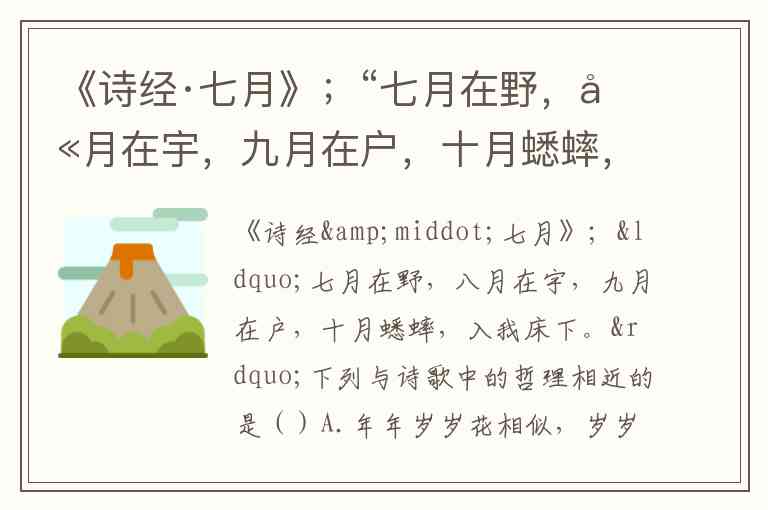 选项中与这一哲理最契合的是C.天有常道矣,地有常数矣。荀子这句话明确指出天地万物皆有其固定规律,与《七月》通过蟋蟀迁移暗示季节循环的思路一致,都强调了对自然秩序的认知与尊重。