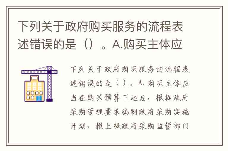 下列关于政府购买服务的流程表述错误的是()。A.购买主体应当在购买预算下达后,根据政府采购管理要求编制政府采购实施计划,报上级政府采购监管部门备案后开展采购活动 B.购买主体应当及时向社会公告购买内容、规模、对承接主体的资质要求和应提交的相关材料等相关信息 C.承接主体应当按合同履行提供服务的义务,认真组织实施服务项目,按时完成服务项目任务,保证服务数量、质量和效果,主动接受有关部门、服务对象及社会监督,严禁转包行为 D.承接主体完成合同约定的服务事项后,购买主体应当及时组织对履约情况进行检查验收,并依据现行财政财务管理制度加强管理