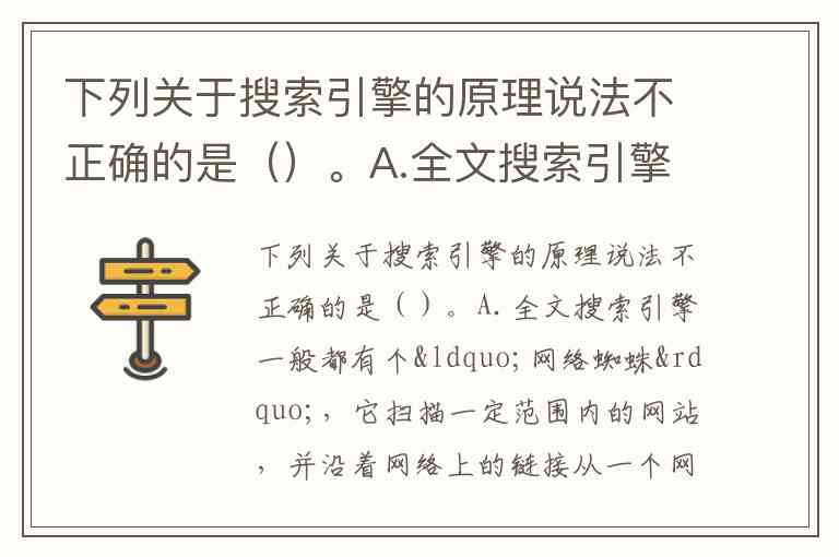 下列关于搜索引擎的原理说法不正确的是()。A.全文搜索引擎一般都有个“网络蜘蛛”,它扫描一定范围内的网站,并沿着网络上的链接从一个网页到另一个网页,采集网页资料。 B.搜索引擎有一个索引数据库,网络机器人或网络蜘蛛采集的网页,经过其它程序进行分析,根据一定的相关度算法进行大量的计算建立网页索引,添加到这个索引数据库中。 C.当你输入关键词进行查询时,搜索引擎会从庞大的数据库中找到符合该关键词的所有相关网页的索引呈现给我们。所以,当我们以同一关键词用不同的搜索引擎查询时,搜索结果是相同。 D.和全文搜索引擎一样,分类目录的整个工作过程也同样分为收集信息、分析信息和查询信息三部分,只不过分类目录的收集、分析信息两部分主要依靠人工完成。