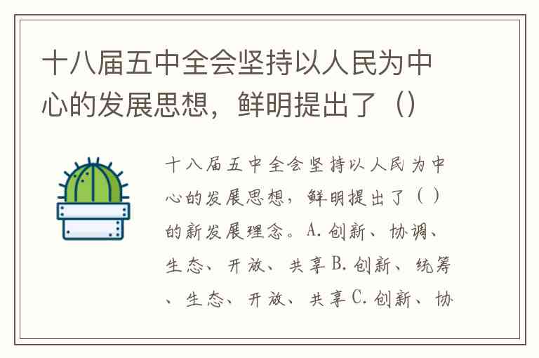 十八届五中全会坚持以人民为中心的发展思想,鲜明提出了()的新发展理念。A.创新、协调、生态、开放、共享 B.创新、统筹、生态、开放、共享 C.创新、协调、绿色、开放、共享 D.创新、协调、绿色、改革、共享