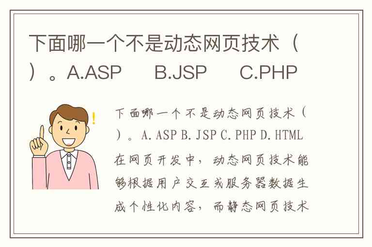 在网页开发中,动态网页技术能够根据用户交互或服务器数据生成个性化内容,而静态网页技术仅提供固定不变的信息。题目中HTML不是动态网页技术,它是用于构建网页结构的标记语言,无法处理服务器端逻辑或用户交互后的动态内容更新。