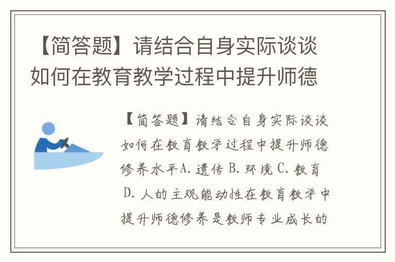 【简答题】请结合自身实际谈谈如何在教育教学过程中提升师德修养水平A.遗传 B.环境 C.教育 D.人的主观能动性