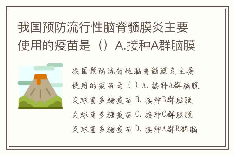 我国预防流行性脑脊髓膜炎主要使用的疫苗是()A.接种A群脑膜炎球菌多糖疫苗 B.接种B群脑膜炎球菌多糖疫苗 C.接种C群脑膜炎球菌多糖疫苗 D.接种A群B群脑膜炎球菌多糖疫苗 E.接种A+C+Y+W135群脑膜炎球菌多糖疫苗