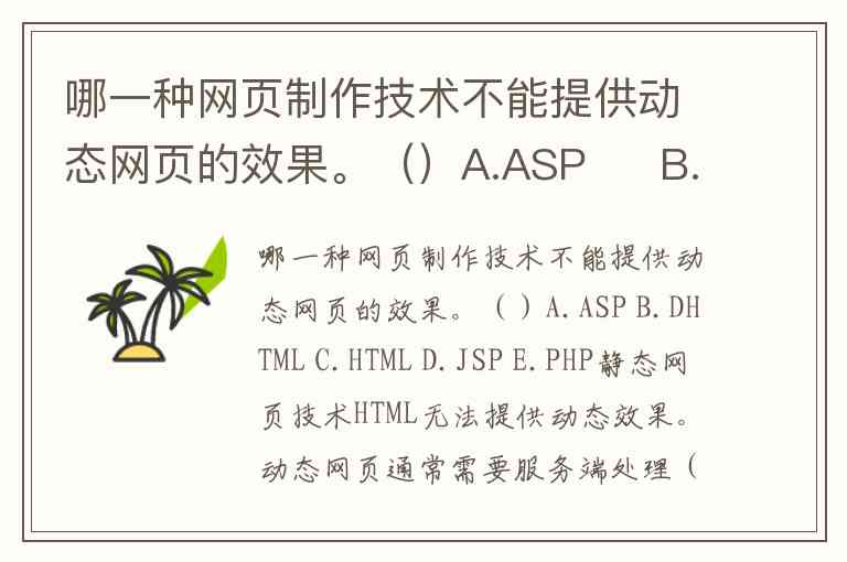 静态网页技术HTML无法提供动态效果。动态网页通常需要服务端处理(如ASP、JSP、PHP)或客户端交互(如DHTML包含的JavaScript/CSS),而HTML仅用于定义网页的静态结构和内容。