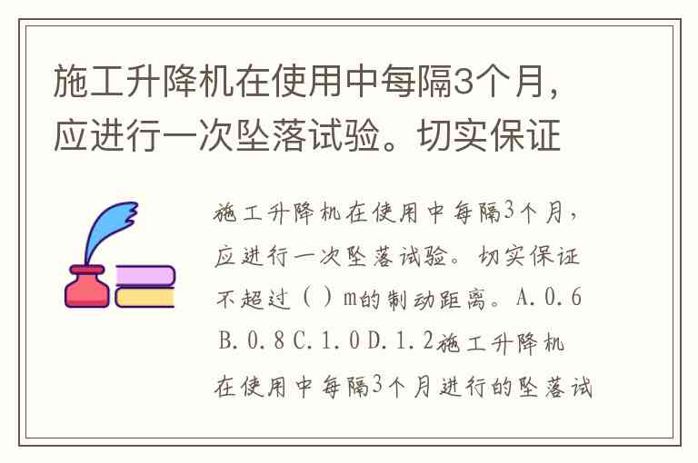 施工升降机在使用中每隔3个月,应进行一次坠落试验。切实保证不超过()m的制动距离。A.0.6 B.0.8 C.1.0 D.1.2