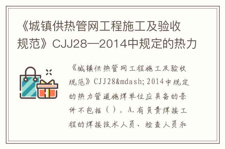《城镇供热管网工程施工及验收规范》CJJ28—2014中规定的热力管道施焊单位应具备的条件不包括()。A.有负责焊接工程的焊接技术人员、检查人员和检验人员 B.应有保证焊接工程质量达到标准的措施 C.焊工应持有有效合格证,并应在合格证准予的范围内焊接 D.应具有施工所需的吊装及安装设备