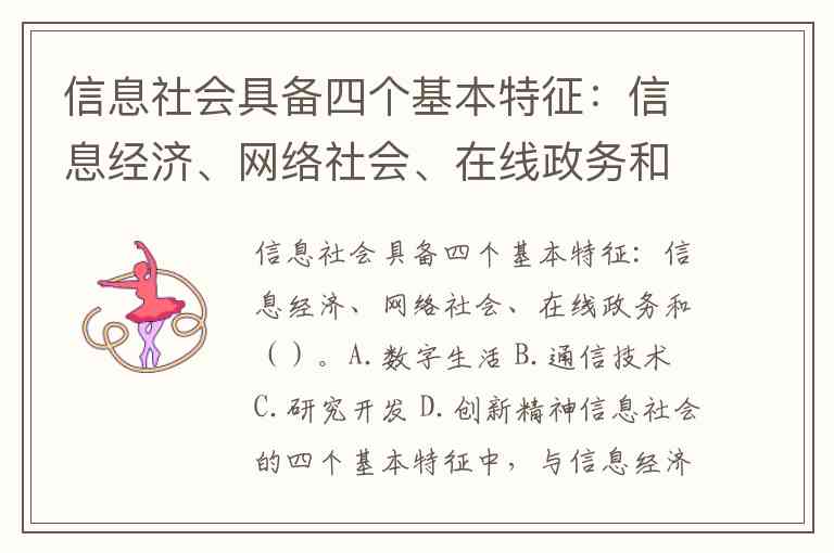 信息社会具备四个基本特征:信息经济、网络社会、在线政务和()。A.数字生活 B.通信技术 C.研究开发 D.创新精神