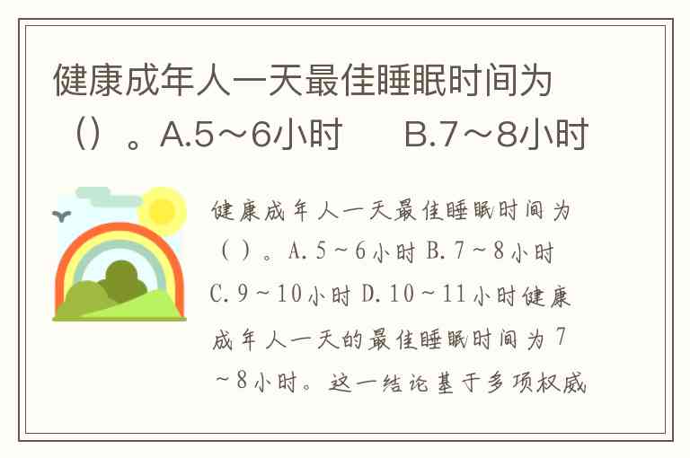 健康成年人一天最佳睡眠时间为()。A.5~6小时 B.7~8小时 C.9~10小时 D.10~11小时