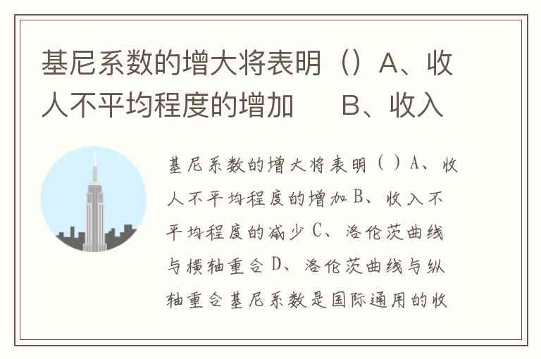 基尼系数的增大将表明()A、收人不平均程度的增加 B、收入不平均程度的减少 C、洛伦茨曲线与横轴重合 D、洛伦茨曲线与纵轴重合