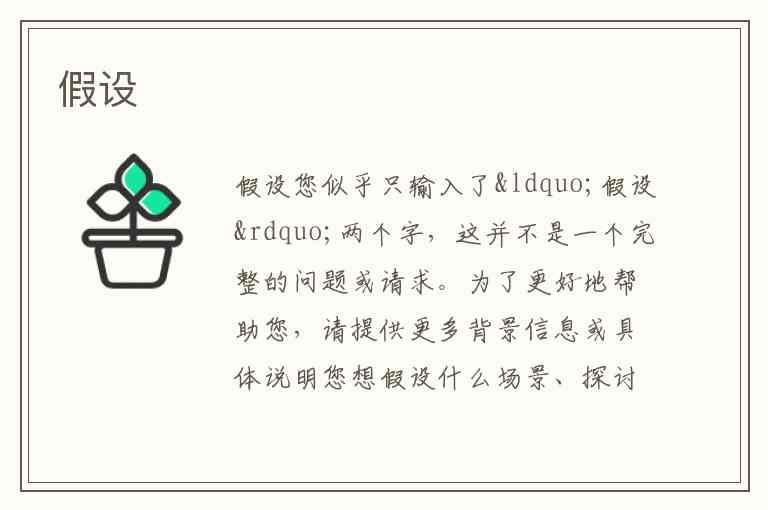 您似乎只输入了“假设”两个字,这并不是一个完整的问题或请求。为了更好地帮助您,请提供更多背景信息或具体说明您想假设什么场景、探讨什么问题。例如:“假设我想创业,应该考虑哪些因素?”或“假设人类移居火星,会面临哪些挑战?”我会根据您的具体需求提供准确且有针对性的解答。