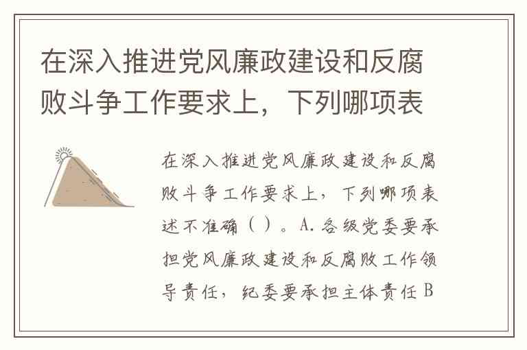 在深入推进党风廉政建设和反腐败斗争工作要求上,下列哪项表述不准确()。A.各级党委要承担党风廉政建设和反腐败工作领导责任,纪委要承担主体责任 B.加强反腐败体制机制创新和制度保障,改革党的纪律检查体制 C.领导班子成员要坚持党风廉政建设“一岗双责” D.各级纪委书记、副书记的提名和考察以上级纪委会同组织部门为主