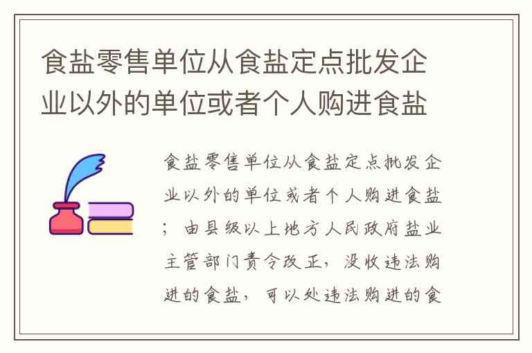 根据《食盐专营办法》(国务院令第696号)规定,食盐零售单位若从非定点批发企业或个人购进食盐,将面临县级以上盐业主管部门的行政处罚:责令改正、没收违法购进食盐,可处货值金额3倍以下罚款。这一处罚条款明确记载于第二十八条第二款,多个官方文件均对此作出一致规定。