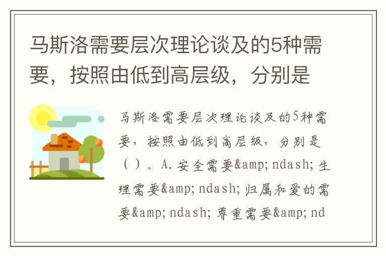 马斯洛需要层次理论谈及的5种需要,按照由低到高层级,分别是()。A.安全需要–生理需要–归属和爱的需要–尊重需要–自我实现的需要 B.生理需要–安全需要–尊重需要–归属和爱的需要–自我实现的需要 C.生理需要–安全需要–归属和爱的需要–尊重需要–自我实现的需要 D.生理需要–安全需要–归属和爱的需要–自我实现的需要–尊重需要