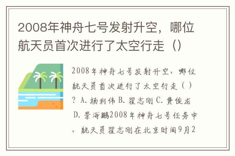 2008年神舟七号发射升空,哪位航天员首次进行了太空行走()?A.杨利伟 B.翟志刚 C.费俊龙 D.景海鹏