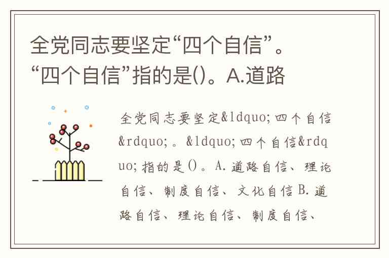 全党同志要坚定“四个自信”。“四个自信”指的是()。A.道路自信、理论自信、制度自信、文化自信 B.道路自信、理论自信、制度自信、思想自信 C.道路自信、思想自信、制度自信、文化自信 D.道路自信、理论自信、思想自信、文化自信