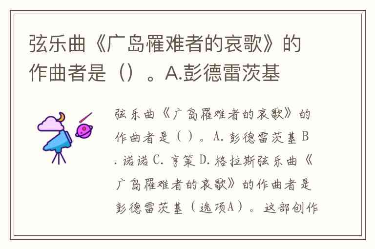 弦乐曲《广岛罹难者的哀歌》的作曲者是彭德雷茨基(选项A)。这部创作于1960年的作品,全称为《广岛受难者的挽歌》(Threnody to the Victims of Hiroshima),是波兰作曲家克里斯托弗·潘德列茨基(Krzysztof Penderecki,又译彭德雷茨基)的成名作,也是20世纪先锋派音乐的里程碑。