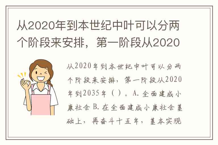 从2020年到本世纪中叶可以分两个阶段来安排,第一阶段从2020年到2035年()。A.全面建成小康社会 B.在全面建成小康社会基础上,再奋斗十五年,基本实现社会主义现代化 C.社会主义现代化建设 D.两个一百年