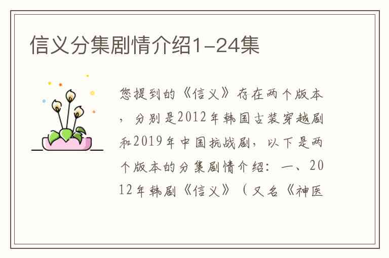 您提到的《信义》存在两个版本,分别是2012年韩国古装穿越剧和2019年中国抗战剧,以下是两个版本的分集剧情介绍: