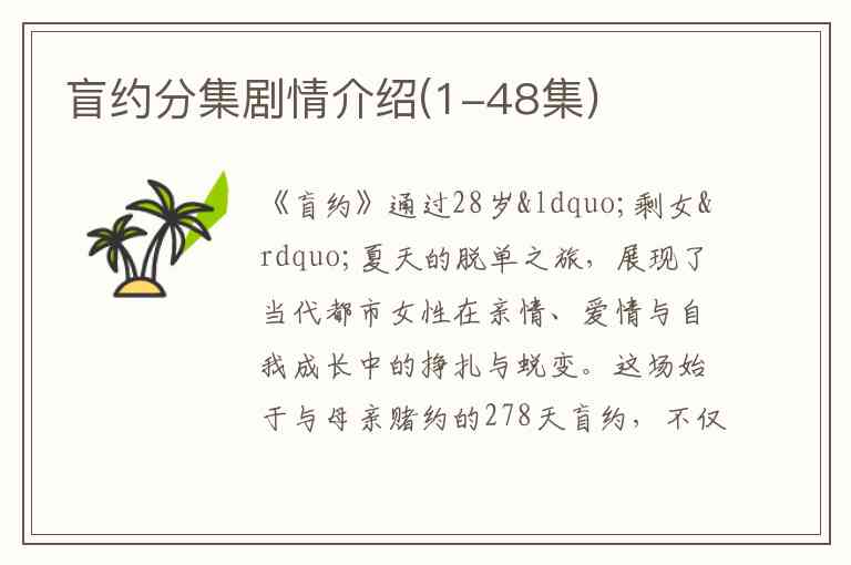 《盲约》通过28岁“剩女”夏天的脱单之旅,展现了当代都市女性在亲情、爱情与自我成长中的挣扎与蜕变。这场始于与母亲赌约的278天盲约,不仅串联起一系列啼笑皆非的相亲故事,更让夏天在认清他人的同时重新发现自我价值。