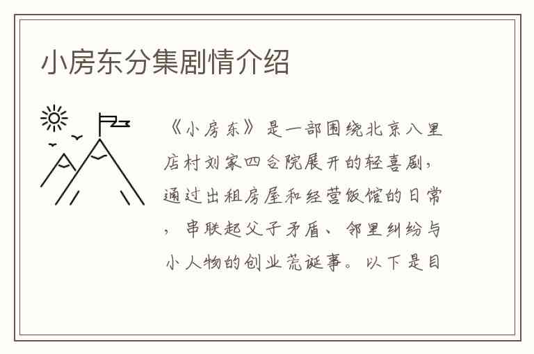 《小房东》是一部围绕北京八里店村刘家四合院展开的轻喜剧,通过出租房屋和经营饭馆的日常,串联起父子矛盾、邻里纠纷与小人物的创业荒诞事。以下是目前可考的详细分集剧情: