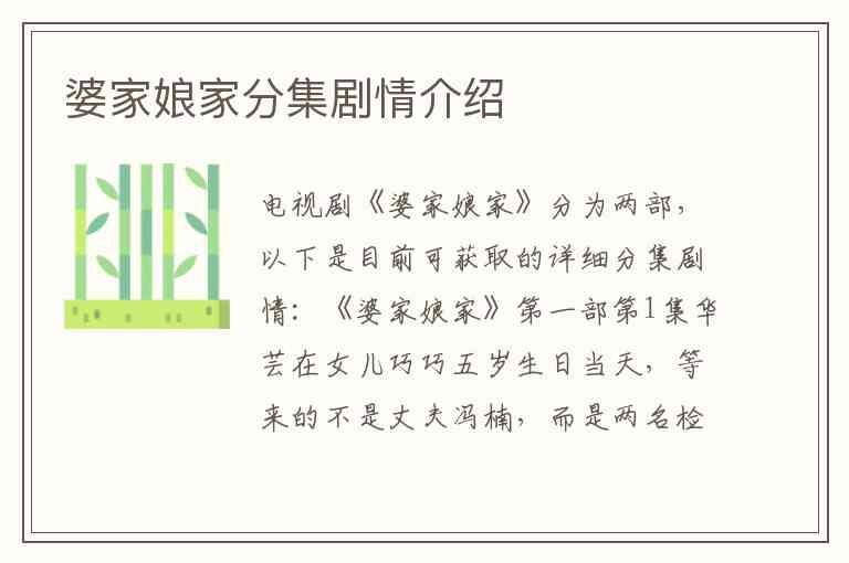 电视剧《婆家娘家》分为两部,以下是目前可获取的详细分集剧情: