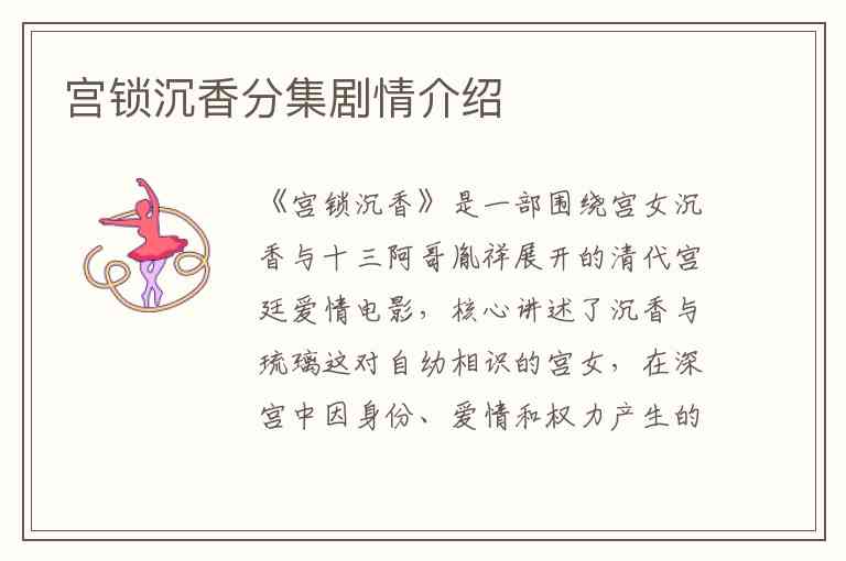 《宫锁沉香》是一部围绕宫女沉香与十三阿哥胤祥展开的清代宫廷爱情电影,核心讲述了沉香与琉璃这对自幼相识的宫女,在深宫中因身份、爱情和权力产生的背叛与救赎。沉香(周冬雨饰)温柔隐忍,与十三阿哥胤祥(陈晓饰)因一幅画像结缘,却被野心勃勃的闺蜜琉璃(赵丽颖饰)冒名顶替,卷入九子夺嫡的宫廷阴谋。以下是基于剧情发展的分阶段解析: