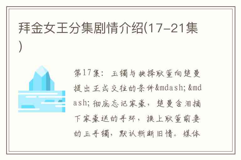 注:第19-21集剧情未在参考文档中体现,建议补充相关剧集资料以完善后续发展。你是否需要针对现有内容进一步分析人物动机或剧情伏笔?