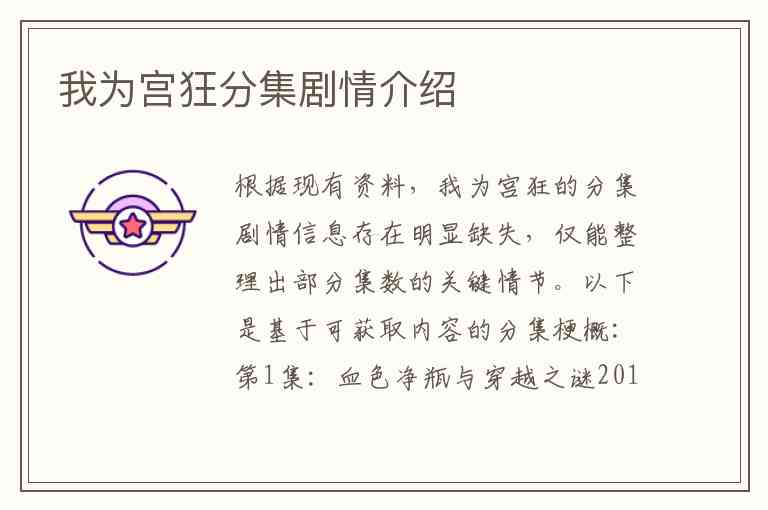 根据现有资料,我为宫狂的分集剧情信息存在明显缺失,仅能整理出部分集数的关键情节。以下是基于可获取内容的分集梗概:
