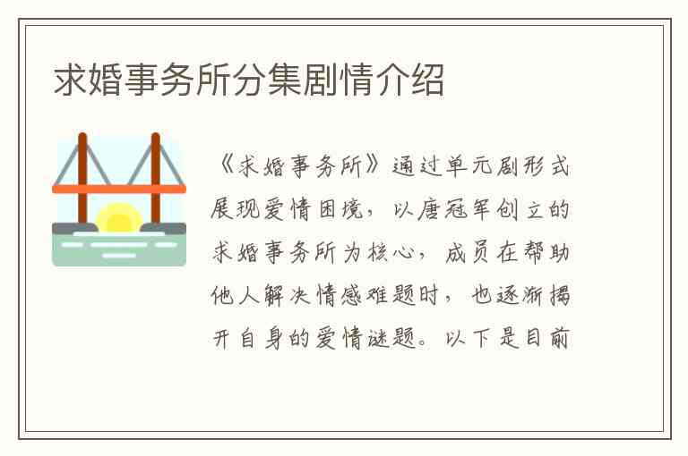 《求婚事务所》通过单元剧形式展现爱情困境,以唐冠军创立的求婚事务所为核心,成员在帮助他人解决情感难题时,也逐渐揭开自身的爱情谜题。以下是目前可获取的分集剧情:
