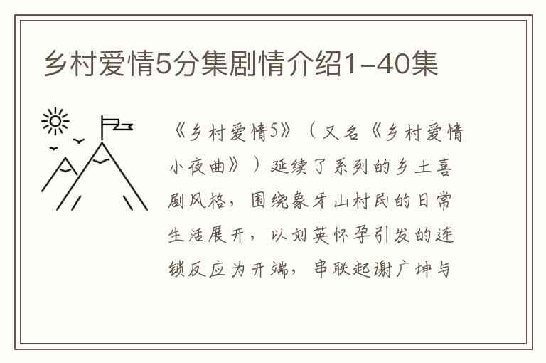 《乡村爱情5》(又名《乡村爱情小夜曲》)延续了系列的乡土喜剧风格,围绕象牙山村民的日常生活展开,以刘英怀孕引发的连锁反应为开端,串联起谢广坤与刘能的持续争斗、长贵与苏玉红的绯闻风波等多条故事线。剧中角色性格鲜明,矛盾冲突密集,展现了东北农村的人情世故与家长里短。以下是1-3集的详细剧情: