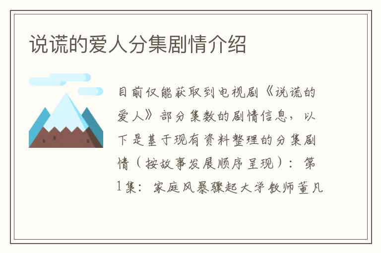 目前仅能获取到电视剧《说谎的爱人》部分集数的剧情信息,以下是基于现有资料整理的分集剧情(按故事发展顺序呈现):
