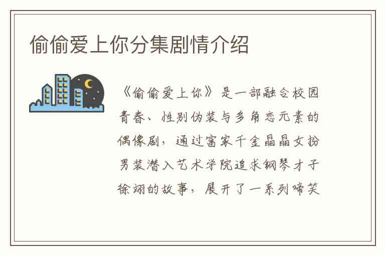 《偷偷爱上你》是一部融合校园青春、性别伪装与多角恋元素的偶像剧,通过富家千金晶晶女扮男装潜入艺术学院追求钢琴才子徐翊的故事,展开了一系列啼笑皆非又情感纠葛的情节。以下是目前可获取的详细分集剧情: