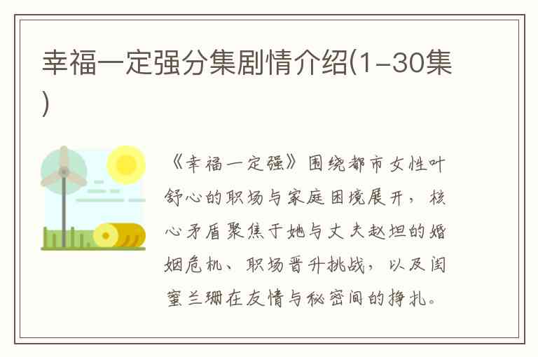 《幸福一定强》围绕都市女性叶舒心的职场与家庭困境展开,核心矛盾聚焦于她与丈夫赵坦的婚姻危机、职场晋升挑战,以及闺蜜兰珊在友情与秘密间的挣扎。以下是1-3集的详细剧情: