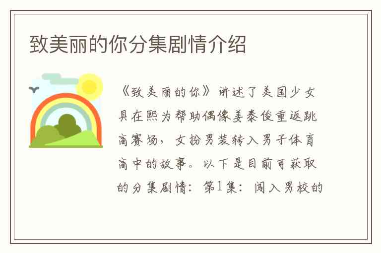 《致美丽的你》讲述了美国少女具在熙为帮助偶像姜泰俊重返跳高赛场,女扮男装转入男子体育高中的故事。以下是目前可获取的分集剧情: