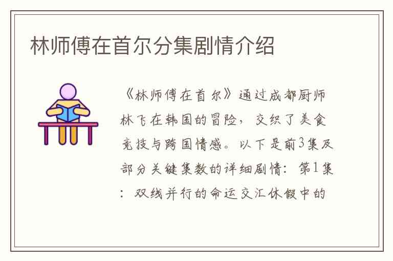 电视剧《林师傅在首尔》的详细分集剧情介绍。该剧讲述了来自中国四川的顶级大厨林飞,为了帮朋友解决危机而前往韩国首尔,在一家面临经营困境的“芙蓉堂”餐厅里,用精湛的厨艺和人格魅力化解矛盾、弘扬中华美食文化,并收获爱情的故事。