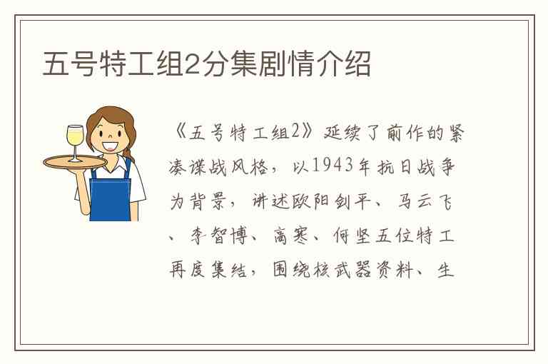 《五号特工组2》延续了前作的紧凑谍战风格,以1943年抗日战争为背景,讲述欧阳剑平、马云飞、李智博、高寒、何坚五位特工再度集结,围绕核武器资料、生化病毒、军火库秘闻等关键任务与日军间谍展开智勇博弈的故事。日本方面则派出酒井美惠子的妹妹酒井朝香,这位手段更毒辣的女间谍成为五号特工组的主要对手。以下是前26集的详细分集剧情: