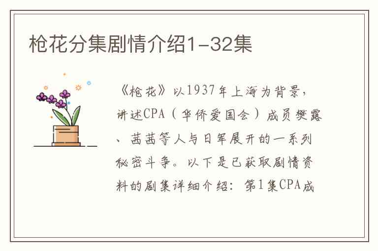 《枪花》以1937年上海为背景,讲述CPA(华侨爱国会)成员樊露、茜茜等人与日军展开的一系列秘密斗争。以下是已获取剧情资料的剧集详细介绍: