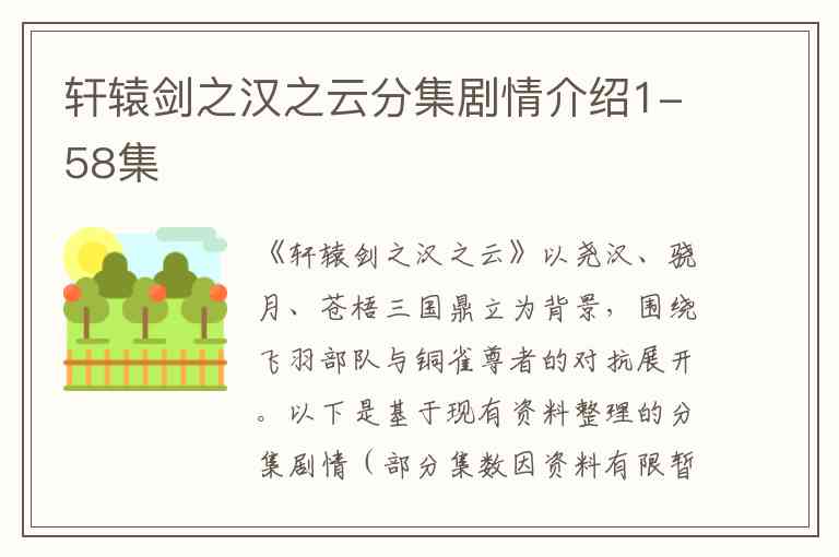 《轩辕剑之汉之云》以尧汉、骁月、苍梧三国鼎立为背景,围绕飞羽部队与铜雀尊者的对抗展开。以下是基于现有资料整理的分集剧情(部分集数因资料有限暂缺,后续可补充完整):