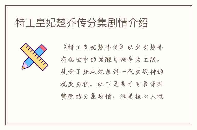 《特工皇妃楚乔传》以少女楚乔在乱世中的觉醒与抗争为主线,展现了她从奴隶到一代女战神的蜕变历程。以下是基于可靠资料整理的分集剧情,涵盖核心人物关系、关键冲突及剧情转折点: