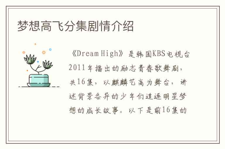 《Dream High》是韩国KBS电视台2011年播出的励志青春歌舞剧,共16集,以麒麟艺高为舞台,讲述背景各异的少年们追逐明星梦想的成长故事。以下是前16集的核心剧情脉络: