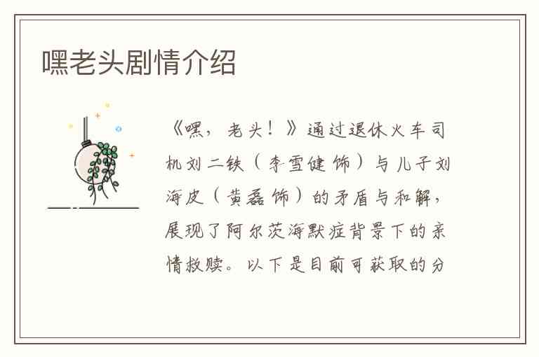 《嘿,老头!》通过退休火车司机刘二铁(李雪健 饰)与儿子刘海皮(黄磊 饰)的矛盾与和解,展现了阿尔茨海默症背景下的亲情救赎。以下是目前可获取的分集剧情(部分集数信息缺失):